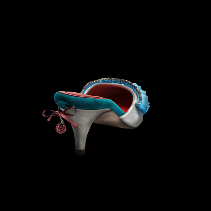- Tira de cristales Swarovski® multicolor: Rematando el borde del plisado, una línea continua de cristales en colores variados (transparentes, rosados, azules, dorados) captura cada destello de luz. No es una línea recta: es una constelación que sigue el contorno ondulante del grosgrain, acentuando cada pliegue. Los Swarovski® no solo brillan: refractan la luz en arcoíris microscópicos.
