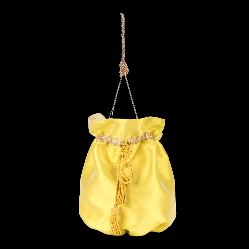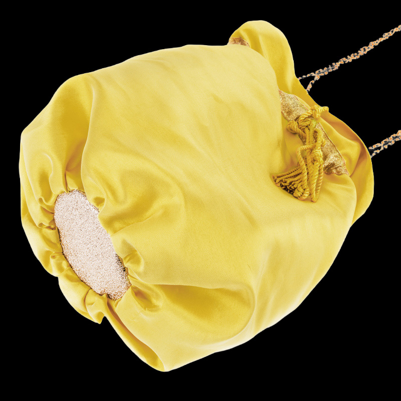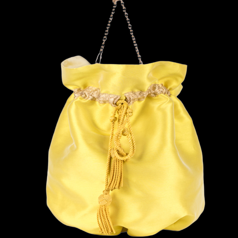 GOLDEN es su color hecho nombre. El amarillo del raso que no grita sino que resplandece, el dorado de la piel de la base, el brillo de la cadena. Todo en este bolso habla el mismo idioma: el del lujo que no necesita logos ni etiquetas para hacerse notar.